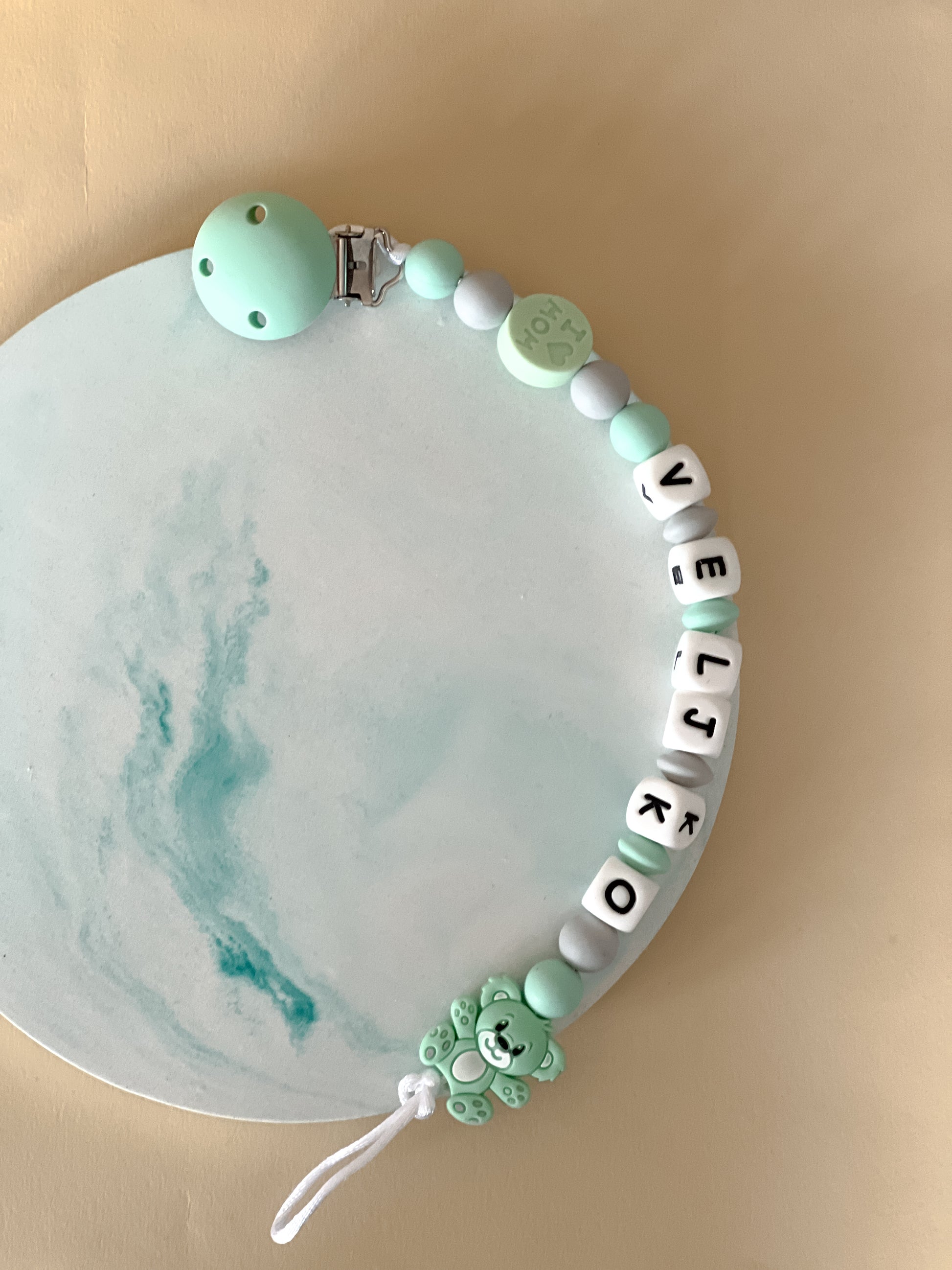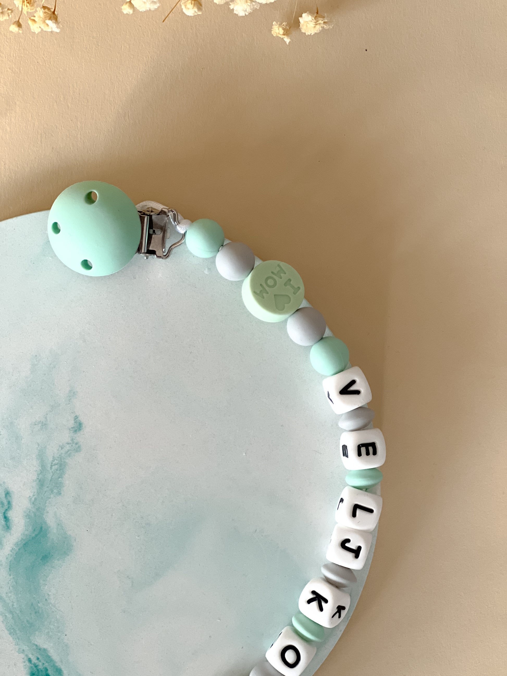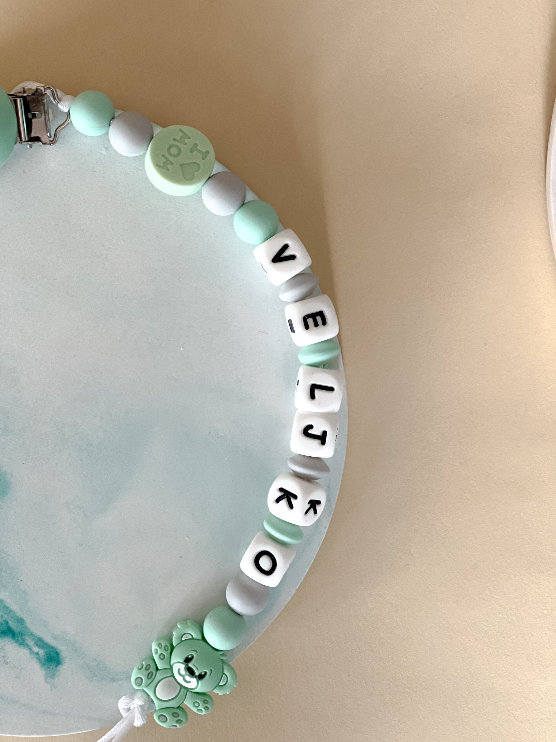 Naš lančić sa imenom deteta, ukrašen okruglom silikonskom klipsom, pažljivo je ručno izrađen sa ljubavlju prema svakom detalju.