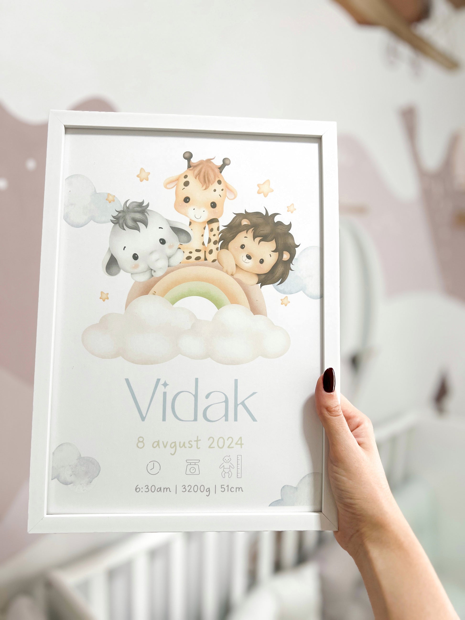 Ovaj poster – karta rođenja je savršen način da sačuvate dragocene informacije o prvom danu vašeg malog anđela. Uključuje sve važne podatke o bebinom rođenju, poput imena, datuma, vremena, težine i visine, sve na jednom mestu, u elegantnom i personalizovanom dizajnu. Kroz prelep prikaz, poster će postati jedinstven podsetnik na taj poseban trenutak i ukrasiti dečiju sobu na nežan i emotivan način.