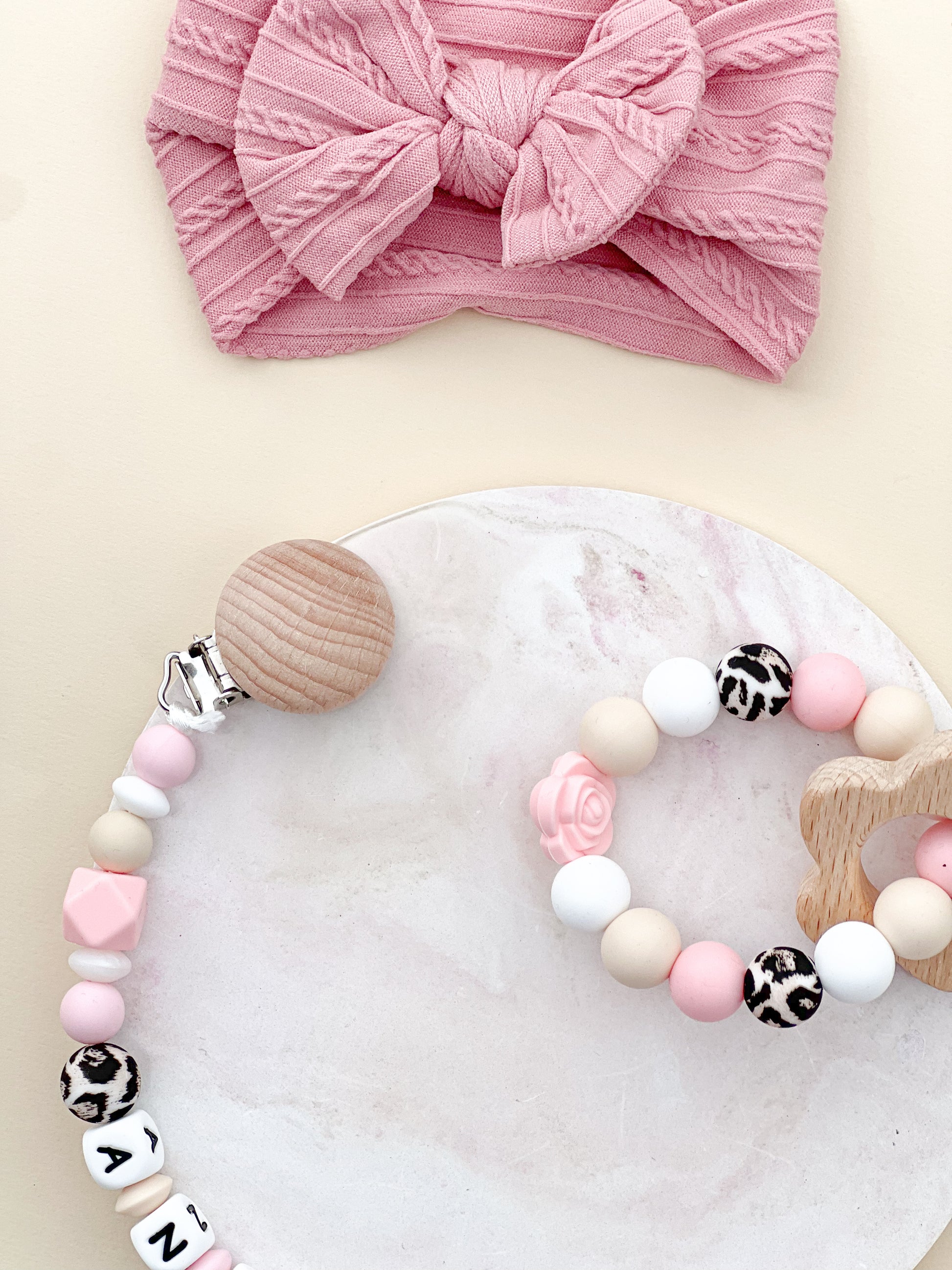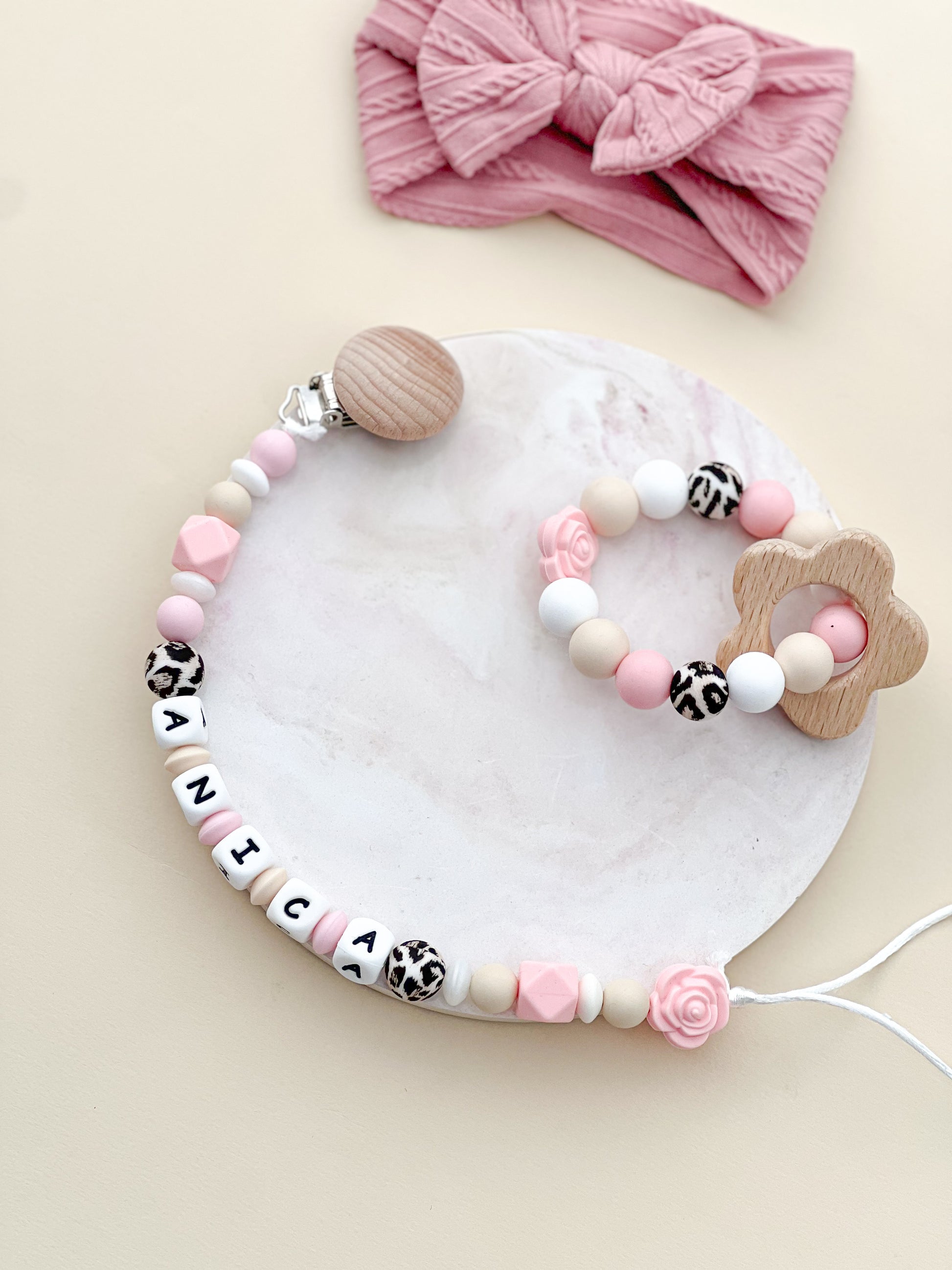 Savršena kombinacija praktičnosti i uspomene. Naš silikonski set uključuje lančić za cuclu sa imenom vaše bebe i silikonsku glodalicu sa datumom rođenja. Izrađen od visokokvalitetnog, sigurnog silikona koji je bezbedan za grickanje, ovaj set je idealan za olakšavanje perioda nicanja zubića, dok ujedno čuva jedinstvene trenutke vašeg deteta. Dodajte lični pečat i sačuvajte uspomene na poseban način
