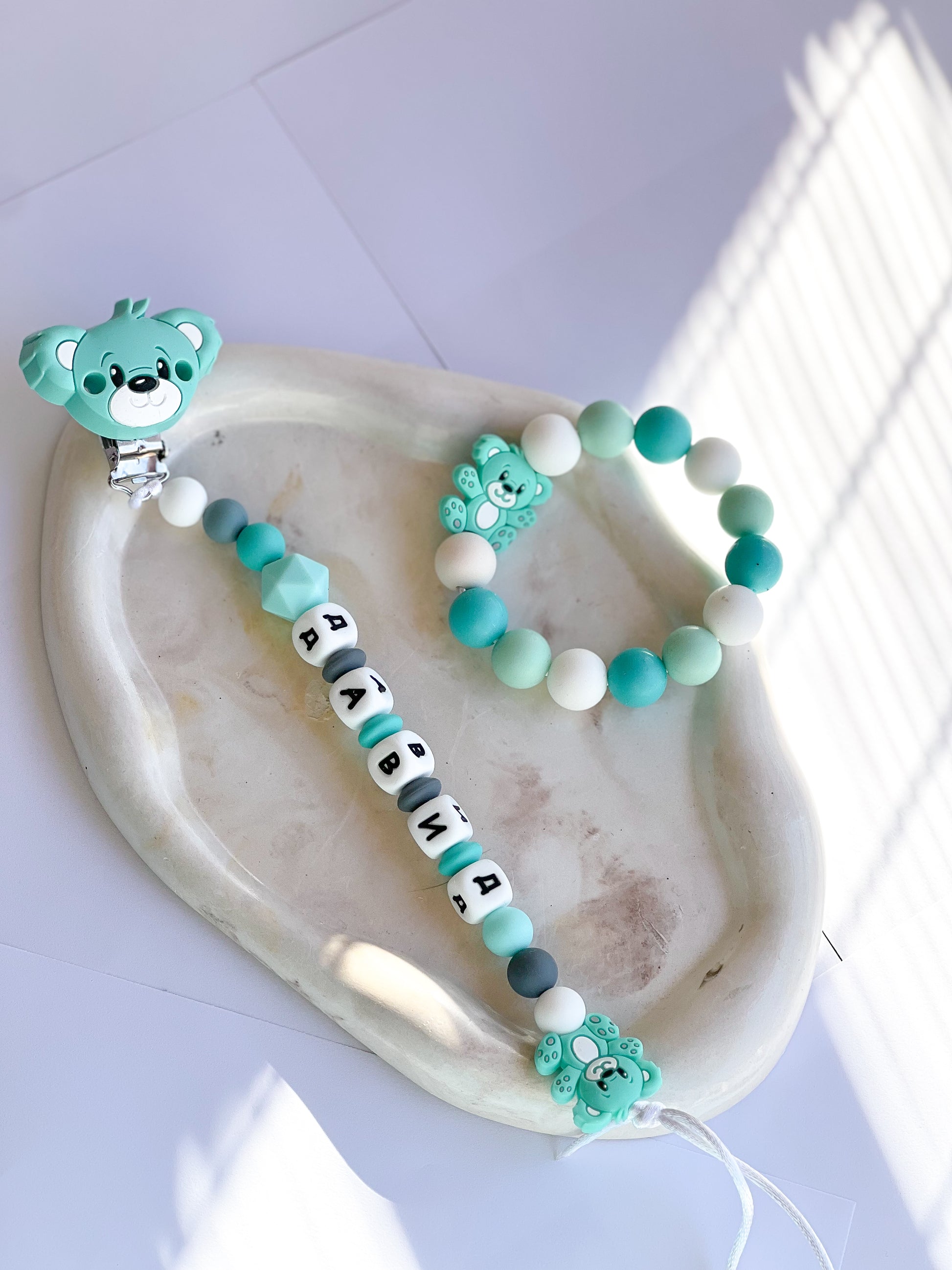 Savršena kombinacija praktičnosti i uspomene. Naš silikonski set uključuje lančić za cuclu sa imenom vaše bebe i silikonsku glodalicu sa datumom rođenja. Izrađen od visokokvalitetnog, sigurnog silikona koji je bezbedan za grickanje, ovaj set je idealan za olakšavanje perioda nicanja zubića, dok ujedno čuva jedinstvene trenutke vašeg deteta. Dodajte lični pečat i sačuvajte uspomene na poseban način