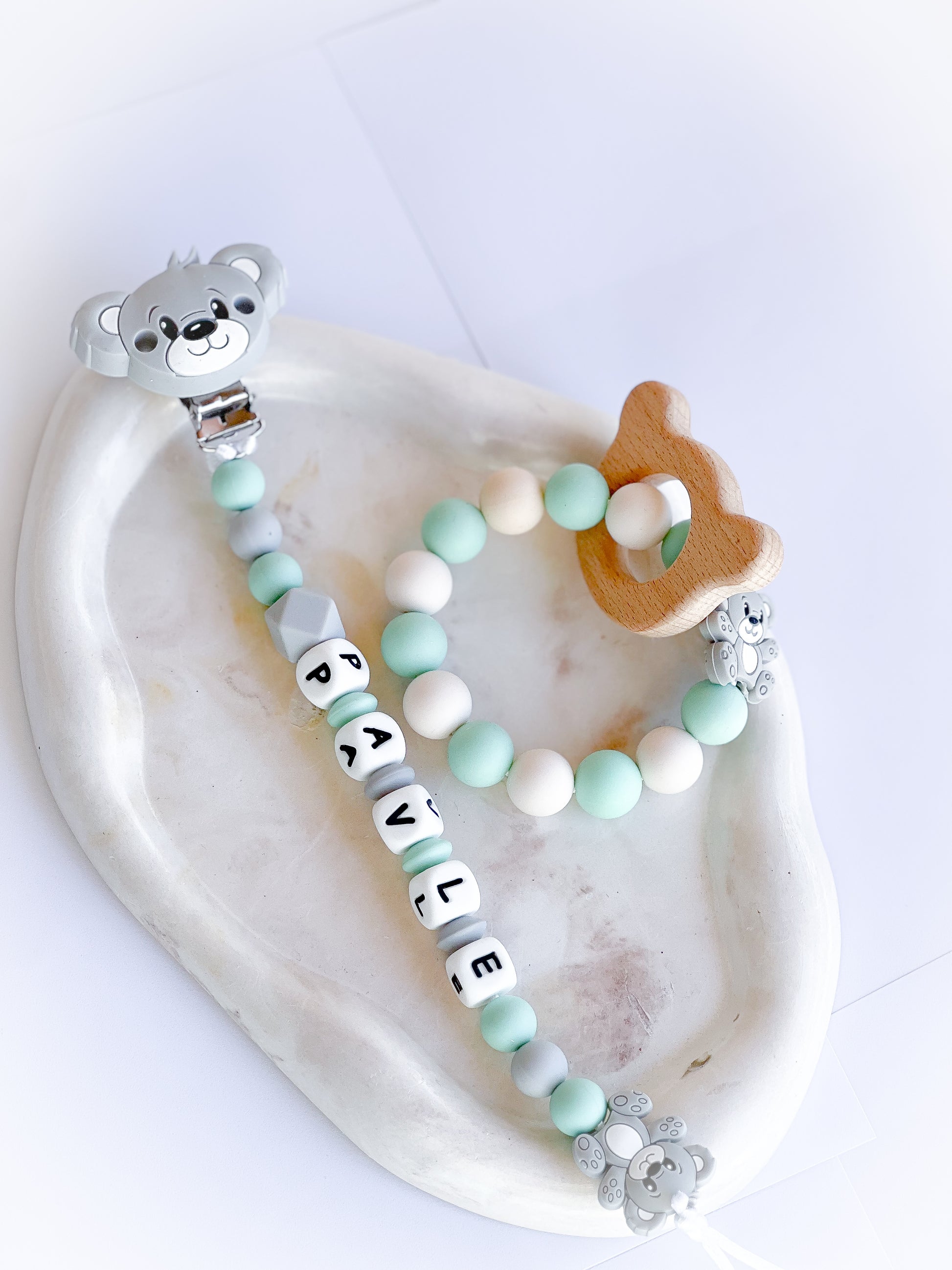 Savršena kombinacija praktičnosti i uspomene. Naš silikonski set uključuje lančić za cuclu sa imenom vaše bebe i silikonsku glodalicu sa datumom rođenja. Izrađen od visokokvalitetnog, sigurnog silikona koji je bezbedan za grickanje, ovaj set je idealan za olakšavanje perioda nicanja zubića, dok ujedno čuva jedinstvene trenutke vašeg deteta. Dodajte lični pečat i sačuvajte uspomene na poseban način