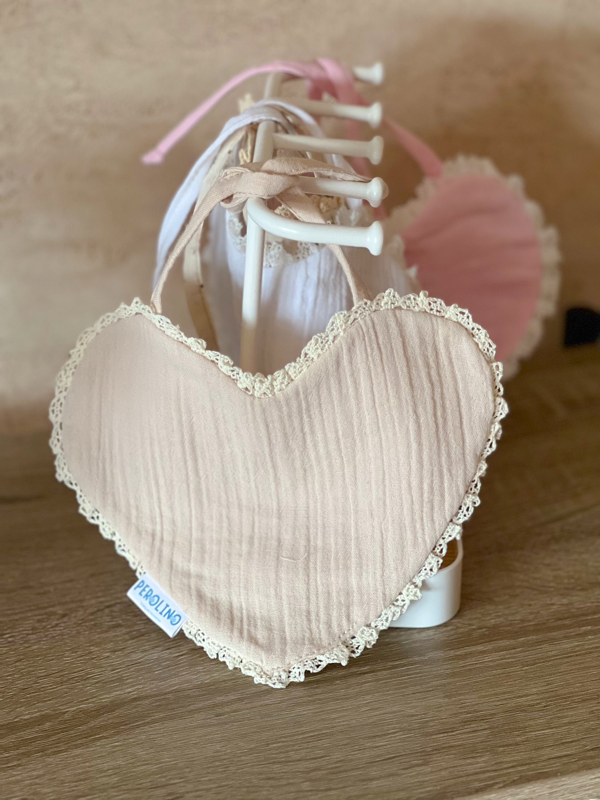 Nežna portikla u obliku srca izrađena je od mekanog i prozračnog muslina koji je prijatan za bebinu osetljivu kožu i dobro upija. Lagani prirodni materijal čini je idealnom za svakodnevno nošenje, tokom hranjenja ili baljenja.