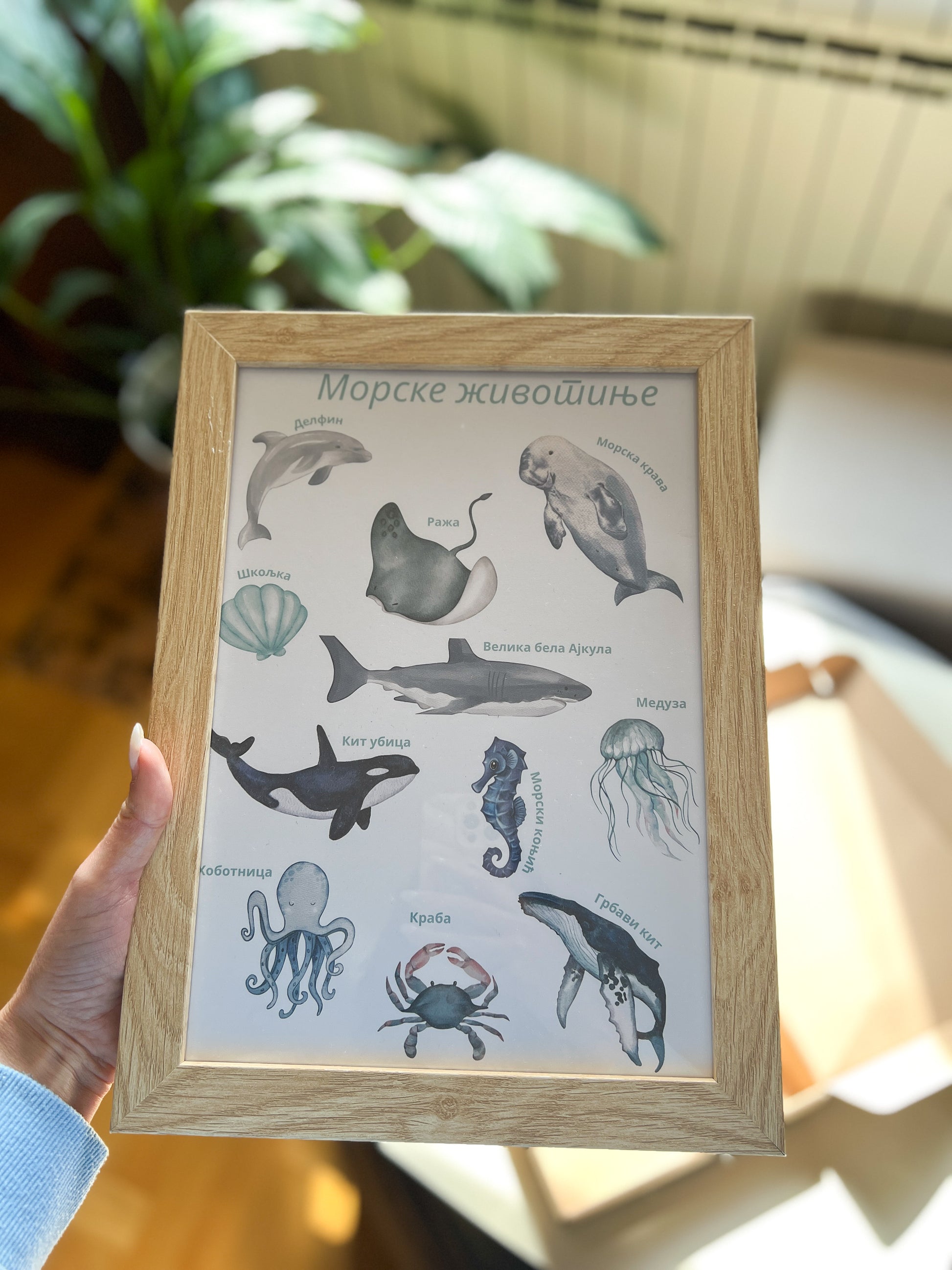 Poster je osmišljen da privuče pažnju mališana i savršeno se uklapa u dečiju sobu, učionicu ili prostor za igru. Sa živopisnim bojama i jasnim ilustracijama, deca će uživati u učenju o morskim životinjama i razvijanju svoje radoznalosti prema podvodnom svetu.