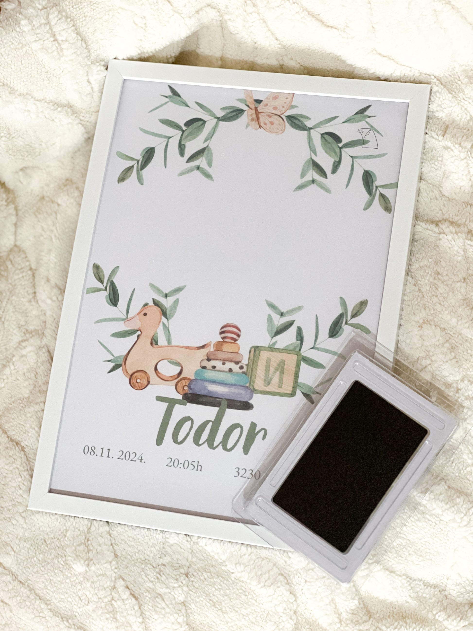 Ovaj posebni poster sa pečatom za otisak stopala savršen je način da sačuvate nezaboravan trenutak iz bebinog života. Uključuje prostor za personalizovane podatke o rođenju, poput imena, datuma, vremena, težine i visine, kao i mesto za otisak stopala vašeg mališana. Kroz nežne ilustracije, poster će postati trajna uspomena na prvi dan života vašeg deteta i lep ukras za dečiju sobu.