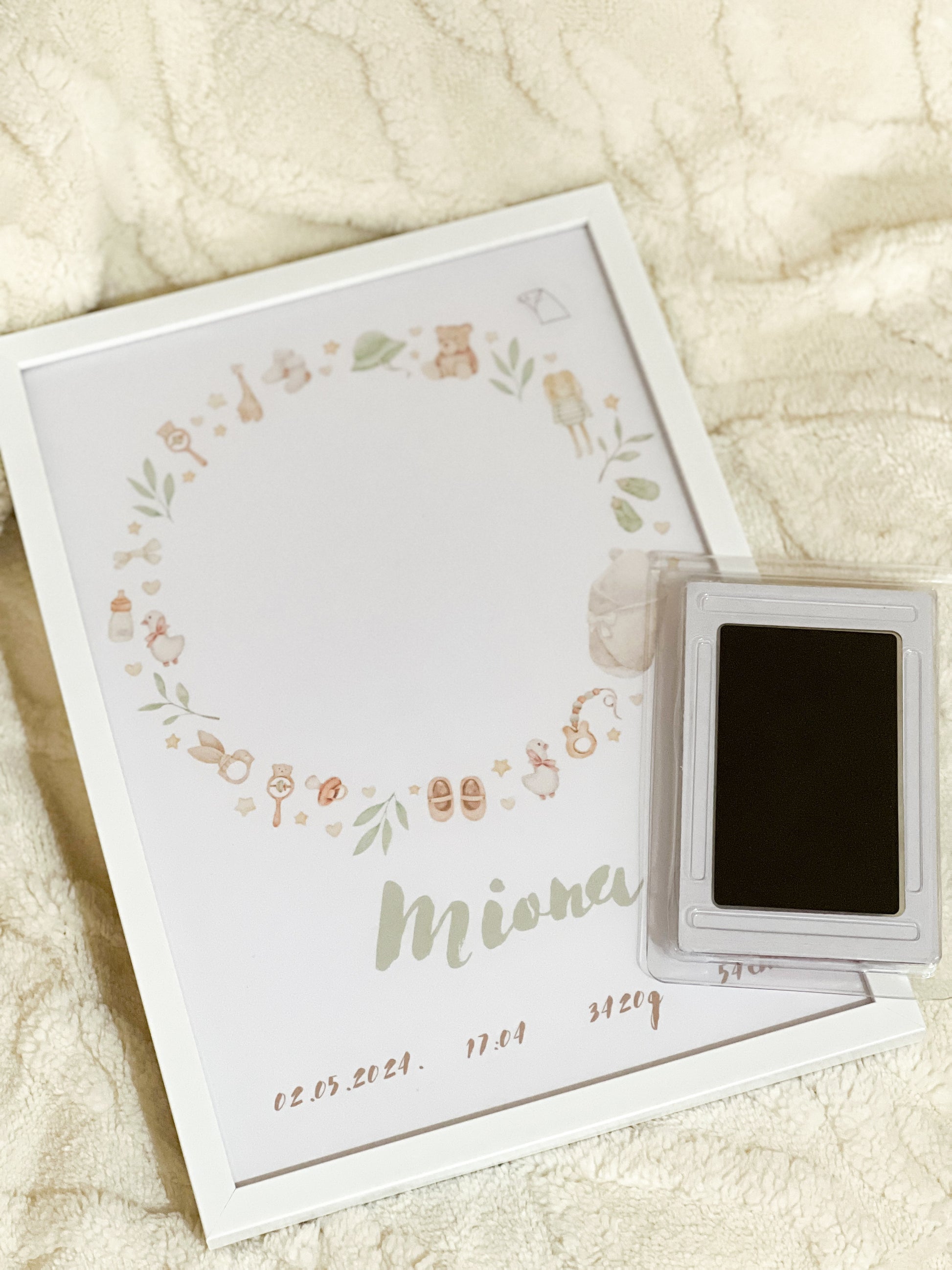 Ovaj posebni poster sa pečatom za otisak stopala savršen je način da sačuvate nezaboravan trenutak iz bebinog života. Uključuje prostor za personalizovane podatke o rođenju, poput imena, datuma, vremena, težine i visine, kao i mesto za otisak stopala vašeg mališana. Kroz nežne ilustracije, poster će postati trajna uspomena na prvi dan života vašeg deteta i lep ukras za dečiju sobu.