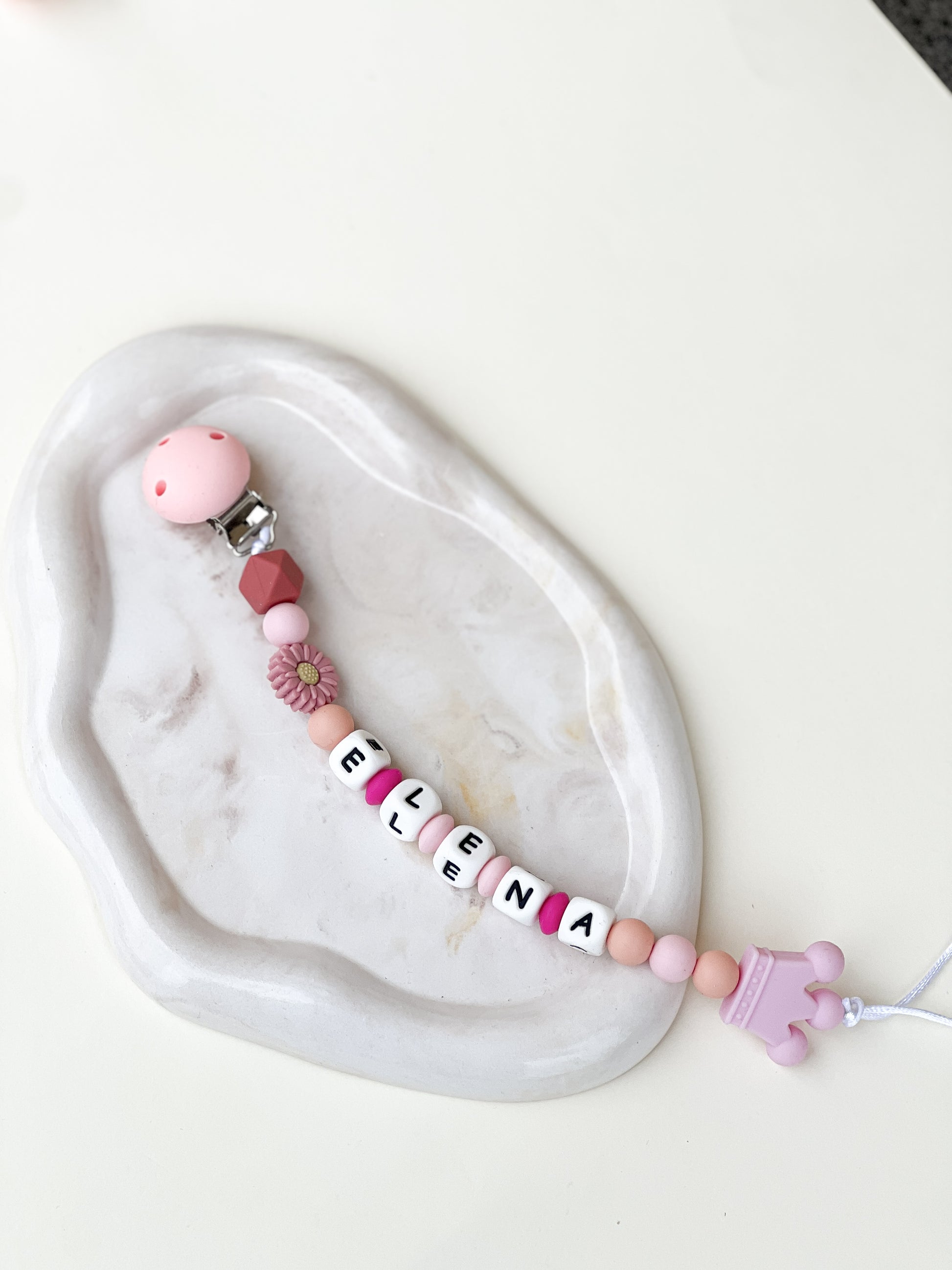 Naš lančić sa imenom deteta, ukrašen okruglom silikonskom klipsom, pažljivo je ručno izrađen sa ljubavlju prema svakom detalju.