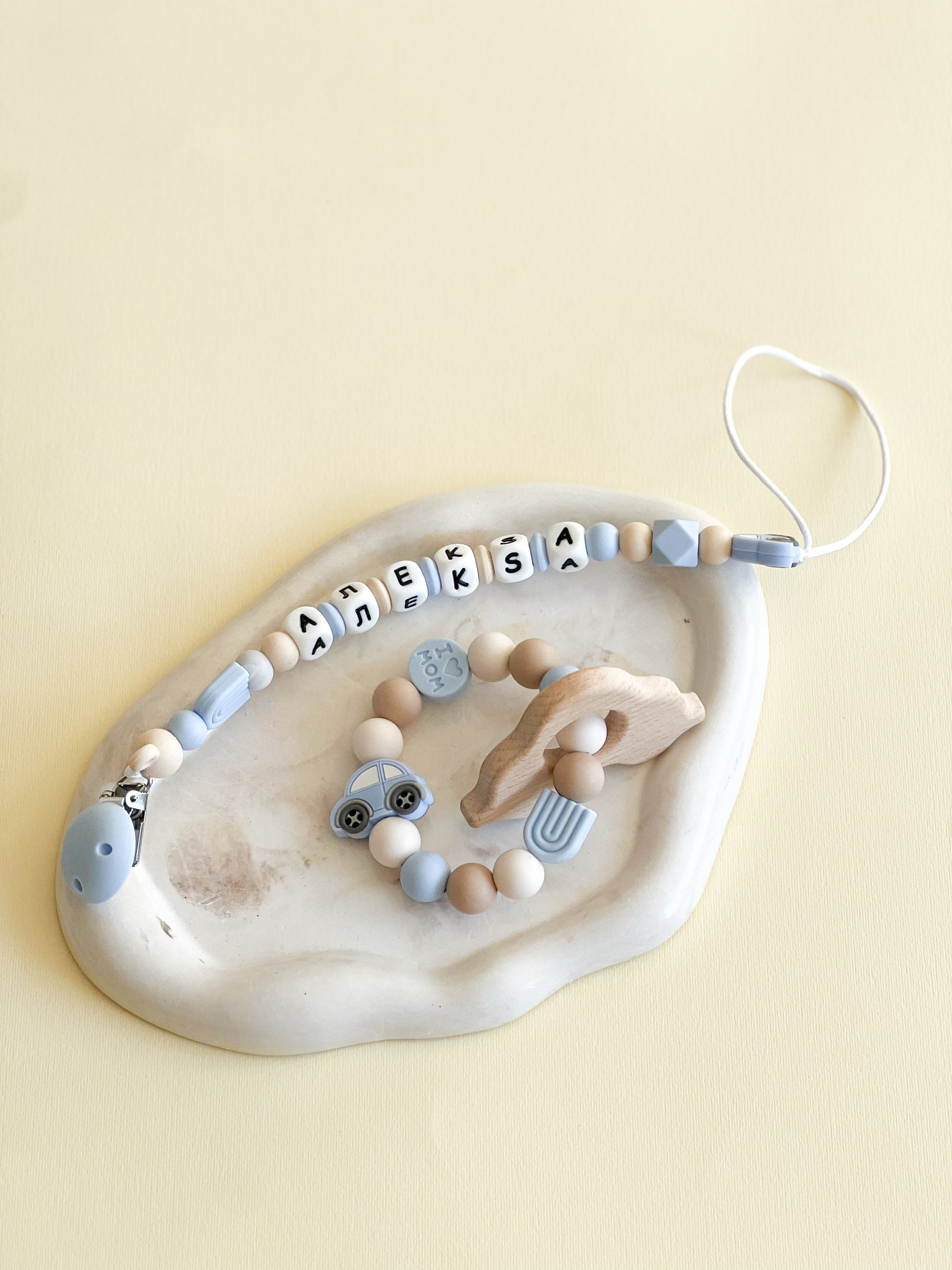Savršena kombinacija praktičnosti i uspomene. Naš silikonski set uključuje lančić za cuclu sa imenom vaše bebe i silikonsku glodalicu sa datumom rođenja. Izrađen od visokokvalitetnog, sigurnog silikona koji je bezbedan za grickanje, ovaj set je idealan za olakšavanje perioda nicanja zubića, dok ujedno čuva jedinstvene trenutke vašeg deteta. Dodajte lični pečat i sačuvajte uspomene na poseban način